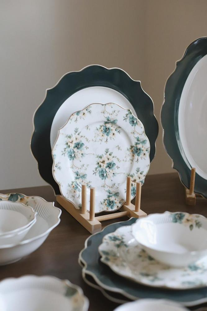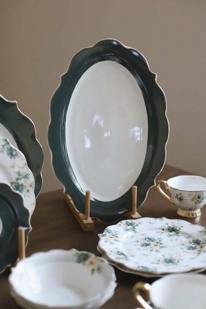 طقم سفره فاخر مكون من 32 قطعه لـ 6 اشخاص لون ابيض و ورود فكتوريه لون اخضر زيتي مع طلاء باللون الذهبي للأطرافيتكون الطقم من6 اكواب شاي او الحليب سعة ال...