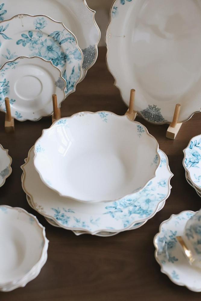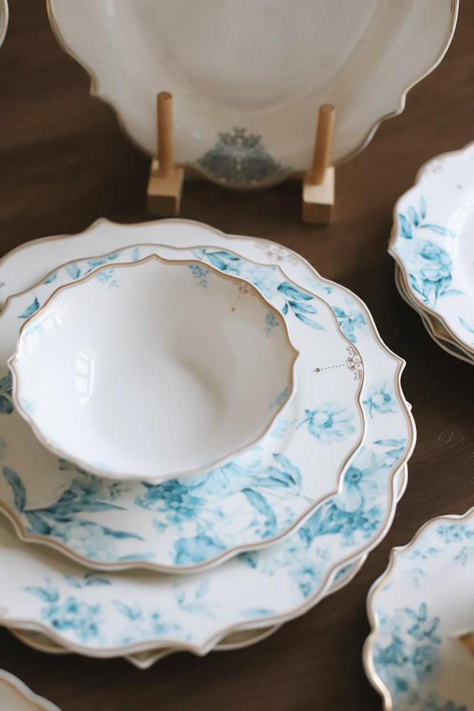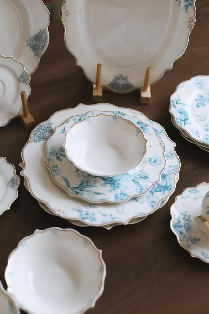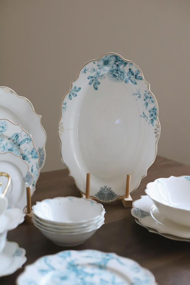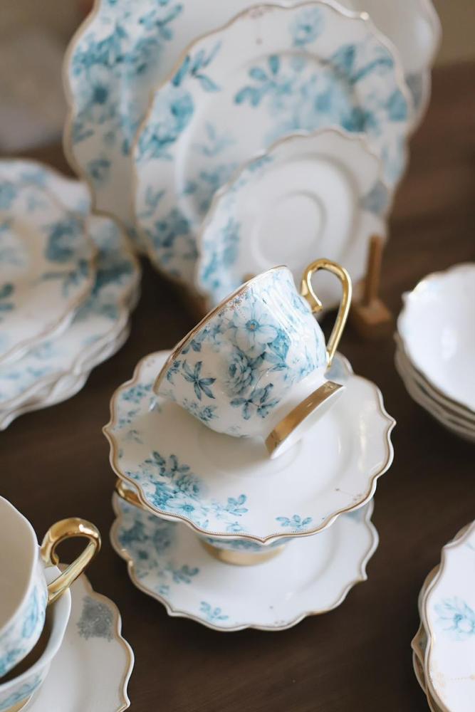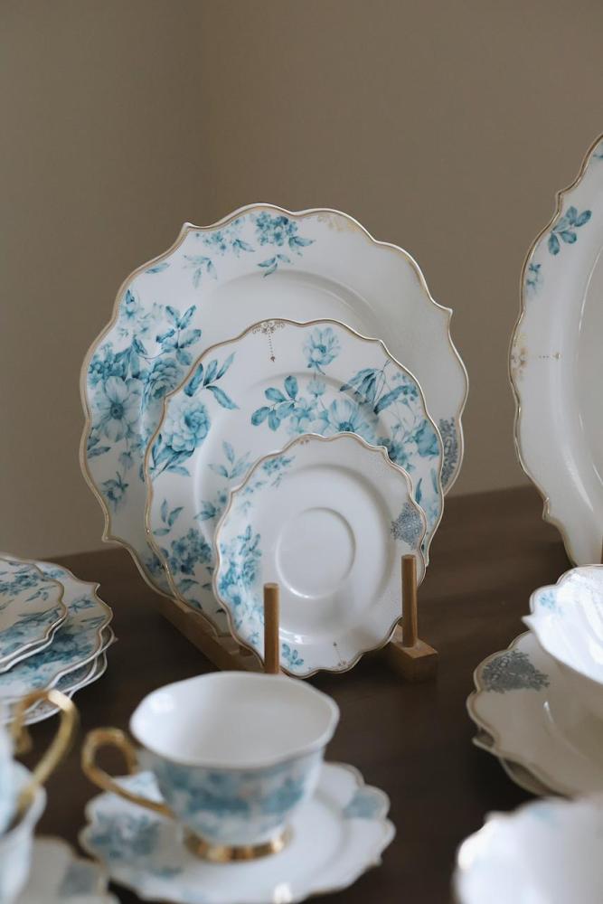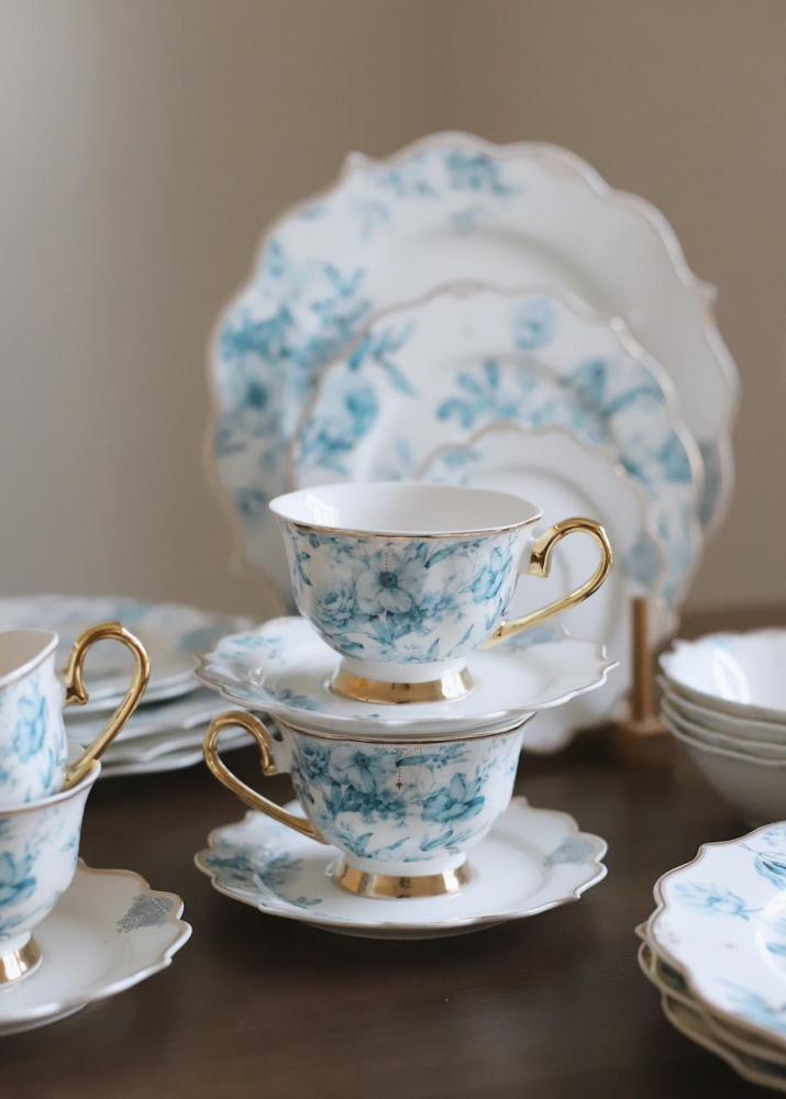 طقم سفره فاخر مكون من 32 قطعه لـ 6 اشخاص لون ابيض و ورود فكتورية لون ازرق فاتح مع طلاء باللون الذهبي للأطرافيتكون الطقم من6 اكواب شاي او الحليب سعة ال...