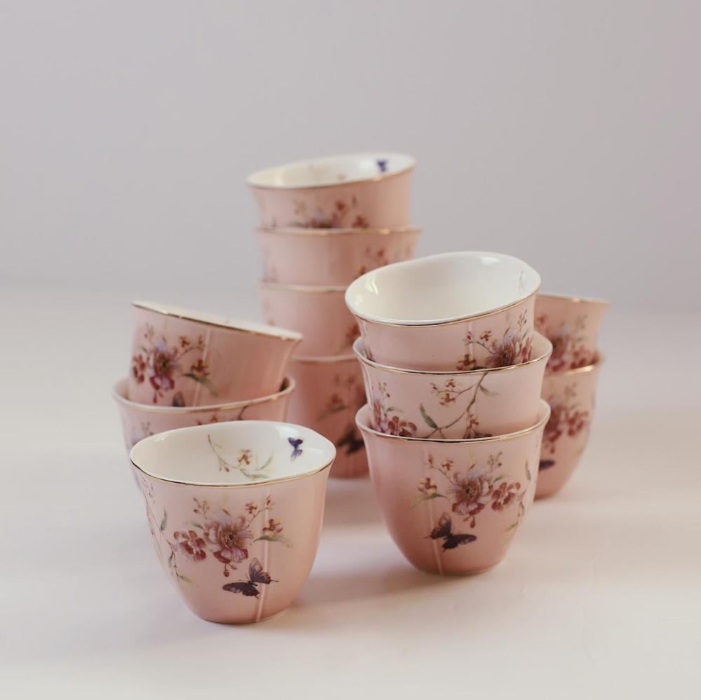 92طقم فناجين قهوة سعودية عدد 12 فنجان لون وردي ورود فكتورية