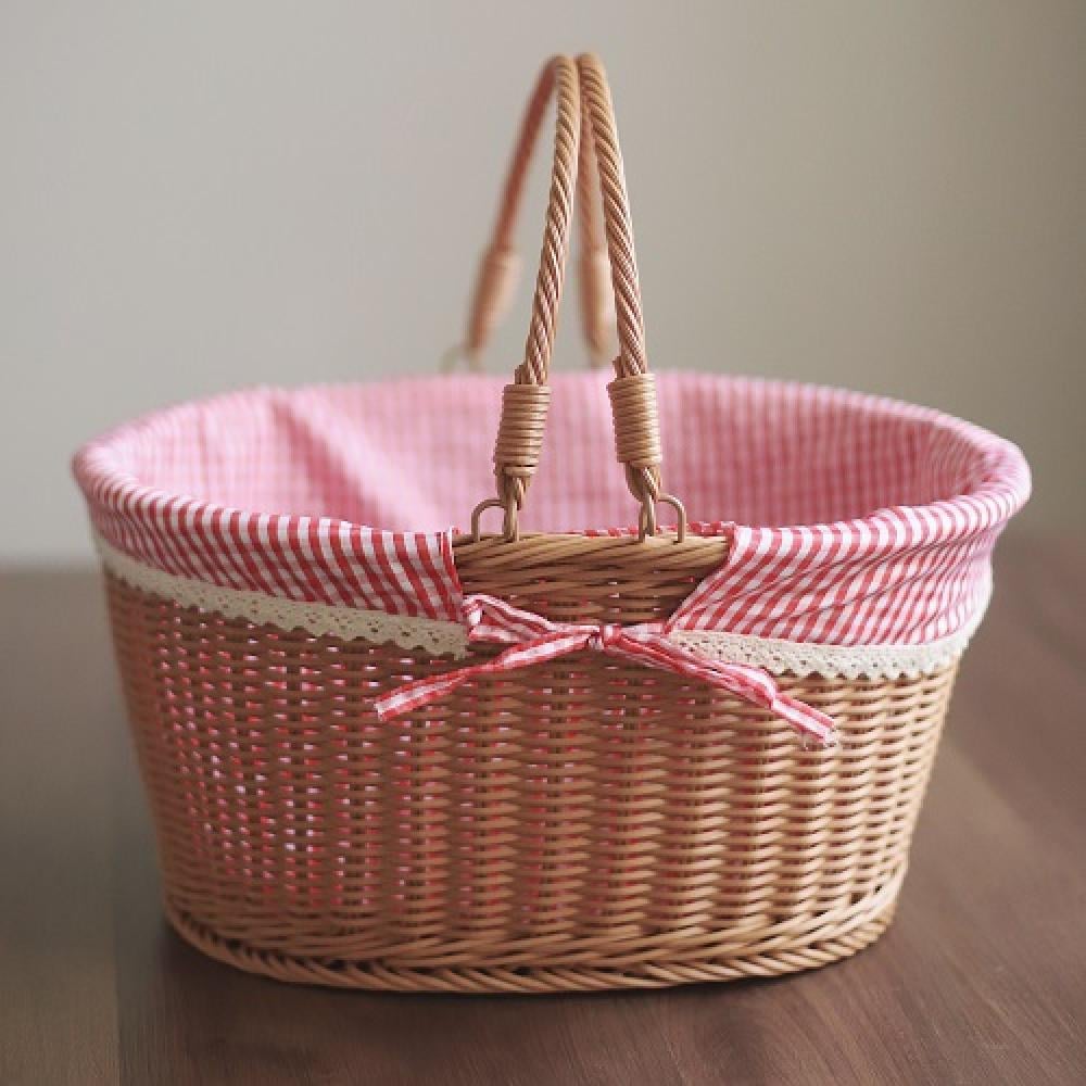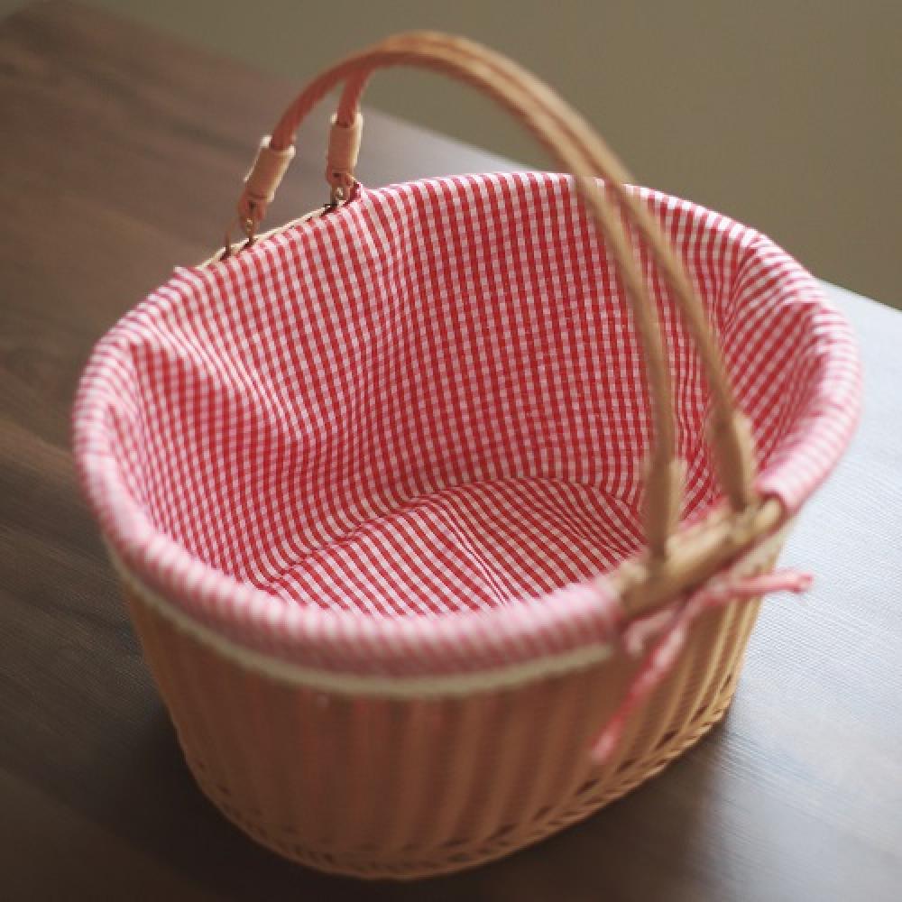 سله لون بني غامق بشكل خوص مصنوعه من البلاستيك مادة PVC وبها غطاء من القماش لون احمر مخطط ابيض مربعات بها مسكة يد قابله للحركه المقاس 39x30x18سمالسعر ي...